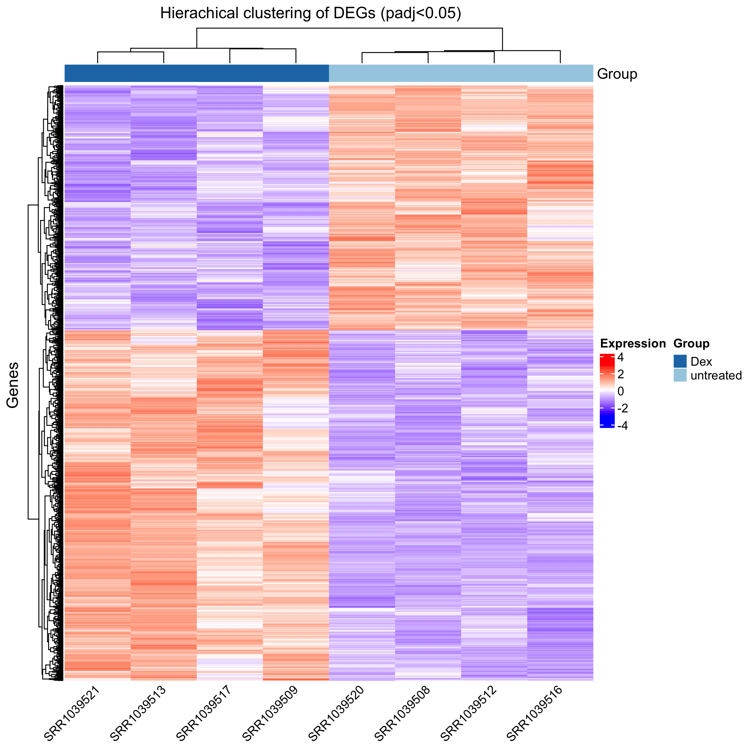 Despite DESeq2 being able to be run in an automated way, it is important to understand the functions and calculations within. If something doesn't look right, you now have the skills and knowledge to be able to pull apart the counts matrix, dds, and results objects. Additionally, plots of heatmaps based on counts, subsetted by variance, or subsetted by the top differentially expressed genes can be useful. The above lines of code should be used as a starting point for a fully explored and annotated differential expression analysis.